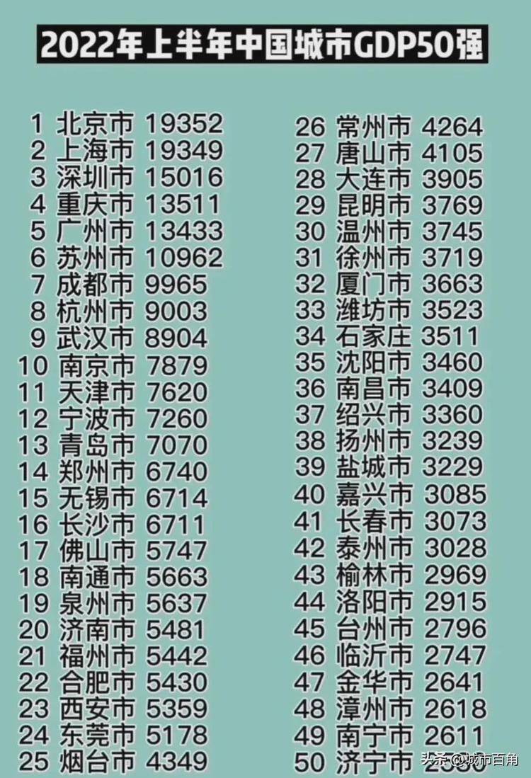 唐山力压大连。你以为唐山是小城市?不,唐山是河北省第一大城市,北方钢都,工业十分发达,又拥有世界级港口。上半年的GDP为4105亿元,力压唐山,处于全国第27,放在东北就是第一。 金华第47。在上半年的GDP为2641亿元,略高于漳州的2618亿元。优势为23亿元。 ![]() |