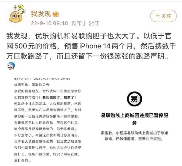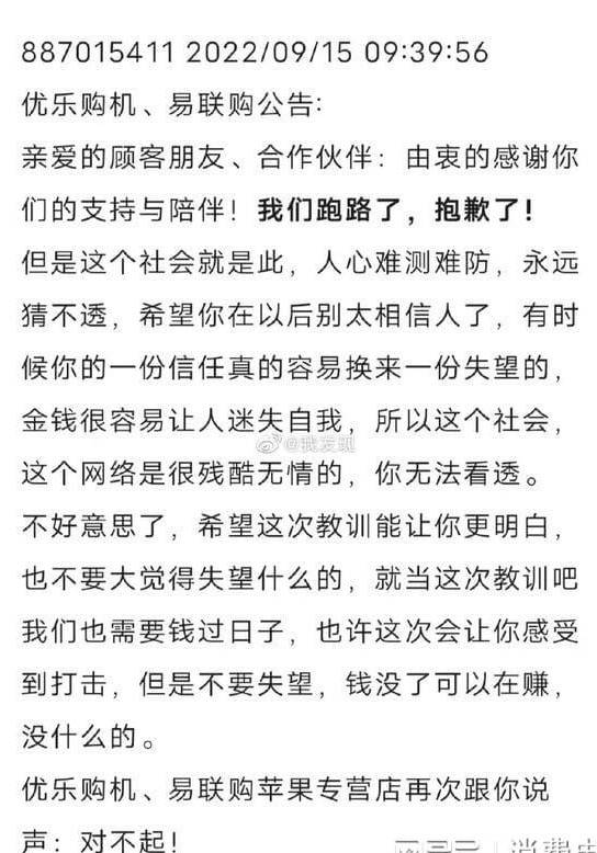 9月16日早晨,有网友“我发现”发现苹果iPhone 14预订平台优乐购机、易联购跑路,且留下一纸嚣张声明。声明日期为:9月15日09:39