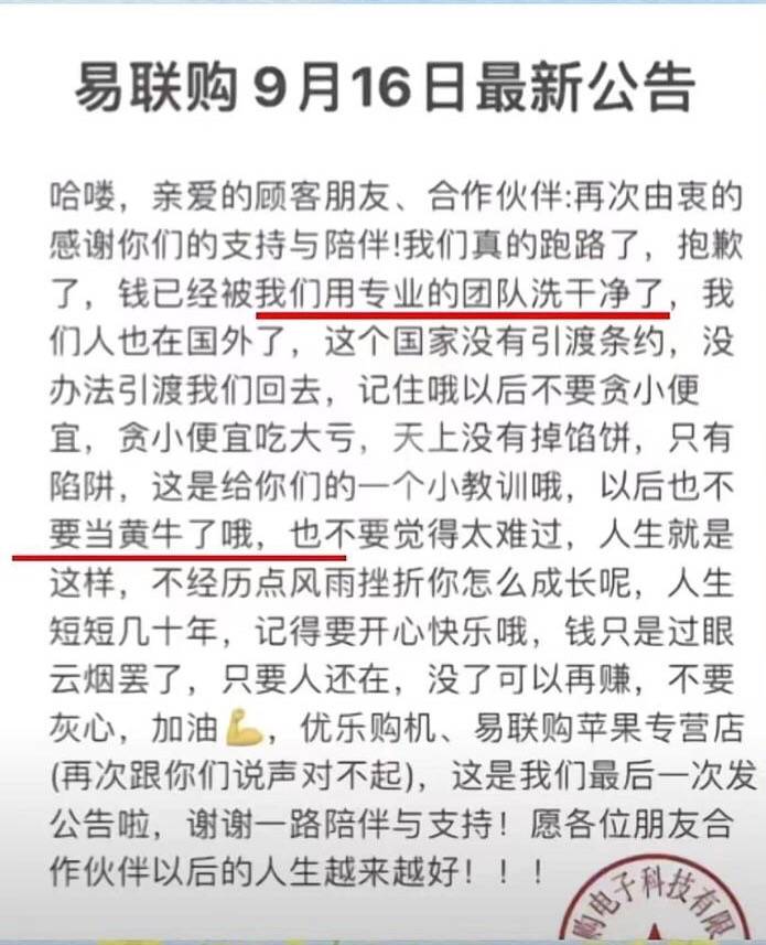![]() ![]() 本来网友以为这就够嚣张了,顿时骂声一片。没想到还有后续,9月16日,跑路的易联购再发第二次声明,对预订用户和黄牛极尽嘲讽之能事,且号称巨款已洗干净,且人已经在国外,原文: 哈喽,亲爱的顾客朋友、合作伙伴:再次由衷的感谢你们的支持与陪伴!我们真的跑路了,抱歉了,钱已经被我们用专业的团队洗干净了我们人也在国外了,这个国家没有引渡条约,没办法引渡我们回去,记住哦以后不要贪小便宜,贪小便宜吃大亏,天上没有掉馅饼,只有陷阱,这是给你们的一个小教训哦,以后也不要当黄牛了哦,也不要觉得太难过,人生就是这样,不经历点风雨挫折你怎么成长呢,人生短短几十年,记得要开心快乐哦,钱只是过眼云烟罢了,只要人还在,没了可以再赚,不要灰心,加油!优乐购机、易联购苹果专营店(再次跟你们说声对不起),这是我们最后一次发公告啦,谢谢一路陪伴与支持!愿各位朋友合作伙伴以后的人生越来越好!! ![]() ![]() |
