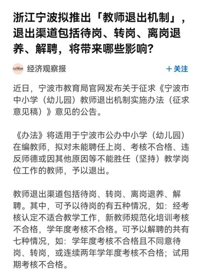 浙江宁波拟推出“教师退出机制”,一举登上热搜。
