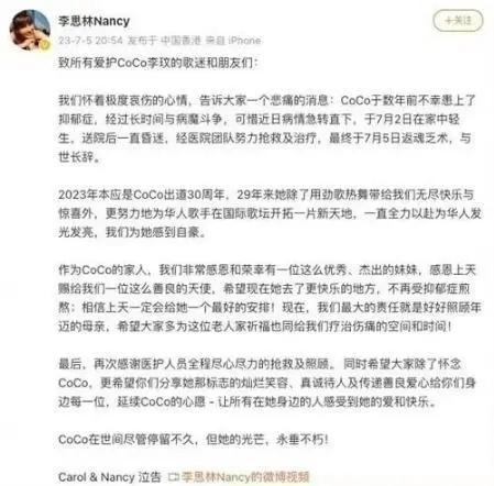 “我们怀着极度哀伤的心情,告诉大家一个悲痛的消息: CoCo于数年前不幸患上了抑郁症,经过长时间与病魔斗争,可惜近日病情急转直下,于7月2日在家中轻生送院后一直昏迷,经医院团队努力抢救及治疗,最终于7月5日与世长辞。”今晚,歌手李玟的姐姐李思林在社交媒体发布消息,称其妹妹李玟轻生去世,年仅48岁。 ![]() ![]() 李玟,原名李美林,1975年1月17日出生于香港,9岁移民美国加州旧金山。高中时期,任排球校队队长。大学时期,连续四年任学生会会长。1991年,代表学校参加美国妙龄小姐选美,获得冠军。次年,参加美国加州地区歌唱大赛,获得冠军。1993年,李玟获得香港TVB举办的《新秀歌唱大赛》亚军,在香港地区出道。1998年,李玟发行音乐专辑《Di Da Di暗示》,在亚洲取得180万张销量;2001年,她演唱的歌曲《A Love Before Time》获得第73届奥斯卡金像奖最佳原创歌曲提名,因此成为首位献唱奥斯卡的华人歌手;2009年,李玟成为首位在华特·迪士尼音乐厅举办个人演唱会的华人歌手;2016年,获得湖南卫视歌唱真人秀节目《我是歌手第四季》“歌王”称号……2023年本是李玟出道30周年,“29年来她除了用劲歌热舞带给我们无尽快乐与惊喜外,更努力地为华人歌手在国际歌坛开拓一片新天地,一直全力以赴为华人发光发亮,我们为她感到自豪。”二姐还表示,作为CoCo的家人,她们非常感恩和荣幸有一位这么优秀、杰出的妹妹,“感恩上天赐给我们一位这么善良的天使,希望现在她去了更快乐的地方,不再受抑郁症煎熬。” |