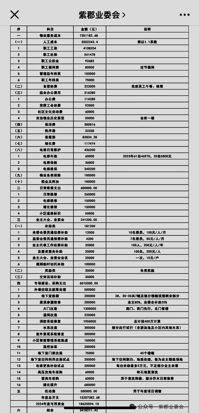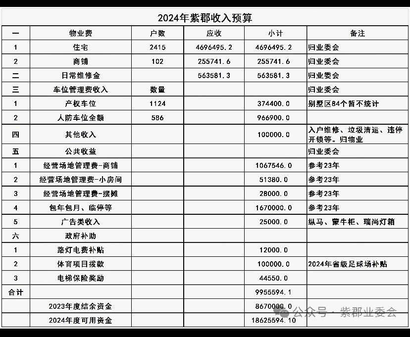 业委会其实很重要❗️赞同。粗粗查一下,你们小区近千户业主,物业费2.8元/平方米,平均户面积按120平方米计算,每户物业费3360元,小区物业费收入330万多,小区出入口三个,物业成本一般不超过200万,还有小区经营、管理用房出租收入,地面停车位(包月150元)收入,造一百多万大门,每户发钱可能。紫郡小区物业自主更能说明问题,请看2024年小区收支预算报表: