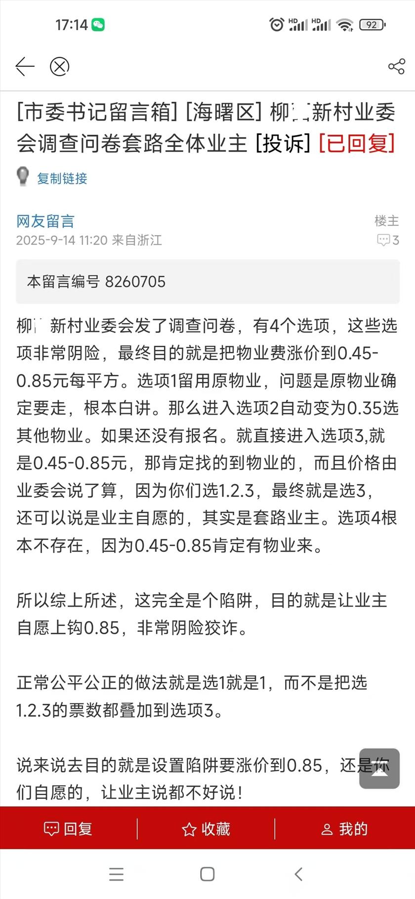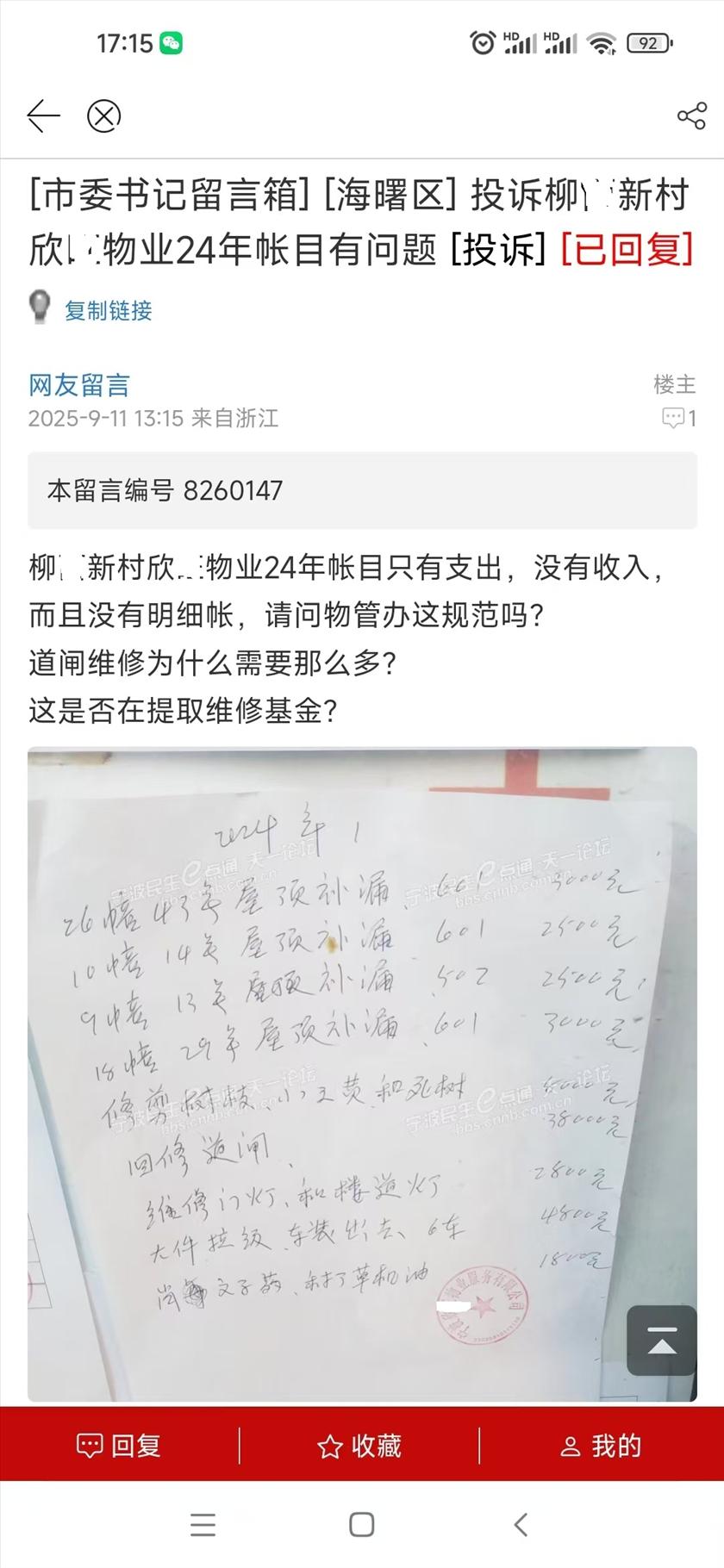 转民生一点通业主的抱怨:长期住在柳X新村的业主都知道,屋顶隔热板都是被旧改施工队踩坏的,而且当时就和原书记金x波反映过,但是她对居民的反映置之不理,说修补屋顶隔热板很贵,没有人出钱修。