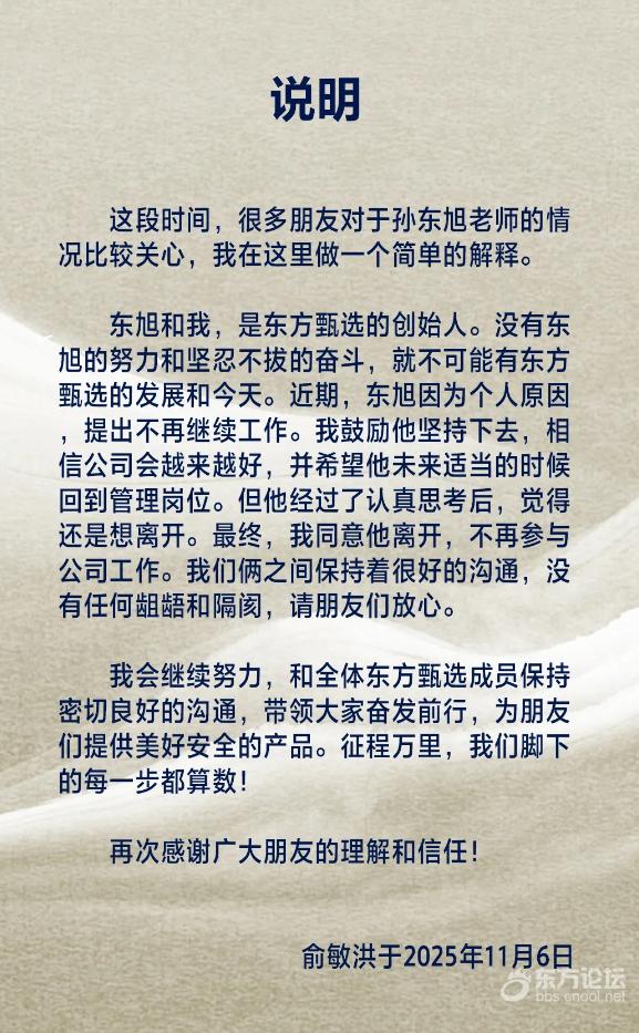 据此前报道,11月6日,俞敏洪发文确认孙东旭从东方甄选离职,并表示“我们俩之间保持着很好的沟通,没有任何龃龉和隔阂,请朋友们放心。”