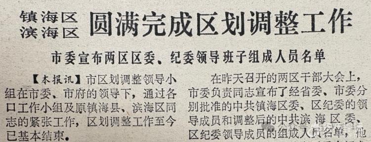 1985年9月29日,中共宁波市委、市政府在镇海县城关镇召开“滨海区、镇海区干部大会”,按照国务院批复和省政府通知的精神,宣布自10月1日起镇海撤县建区,原镇海县的甬江以南为滨海区(1987年7月4日更名为北仑区)、甬江以北为镇海区。 ![]() 镇海撤县建区时,保持原镇海县在甬江以北地区设定的行政区划。镇海区政府下辖骆驼、湾塘2个区;2个区下辖城关、俞范、贵驷、骆驼、澥浦5个镇和临江、清水浦、庄市、湾塘、河头、汶溪、长石7个乡;5镇7乡下辖5个街道、5个新村、152个行政村及若干个居民区等。 ![]() 上世纪80年代的镇海骆驼 李浙东 摄 来源:镇海区档案馆 不久,镇海区对这个行政区划作了调整。1985年12月25日,撤销湾塘、清水浦2个乡,将原湾塘乡所属9个行政村划属俞范镇;将原清水浦乡所属的清水浦、虹桥、五里牌、渡驾桥、沿江5个行政村和勤勇、甬江、同心3个行政村分别划属临江乡和庄市乡。1987年1月19日,撤销骆驼、湾塘2个区;23日,将庄市乡改制为庄市镇。这样镇海区形成了6个镇4个乡的行政区划。 镇海区在调整乡、镇区划的同时,也对行政村、新村、街道及居民区等作了调整。从1986年开始,在城关镇5个街道下设15个居民区,后来又增至24个居民区,在庄市、澥浦、长石、骆驼、贵驷5个乡镇下各设1个居民区,后来在俞范镇又设2个居民区。1987年,城关镇增设城北街道和始建西门新村。1989年6月19日,撤销城北村。 ![]() 上世纪90年代的镇海老城 来源:镇海区档案馆 1990年,镇海区的6镇4乡下辖6个街道、6个新村、151个行政村及31个居民区。其中6个镇的城关镇辖城关胜利路等6个街道(24个居民区)、港务等6个新村和石塘下、张鑑碶2个行政村,还有镇海港区、城北发展区,镇政府驻城关胜利路;俞范镇辖俞范等15个行政村、镇海石化总厂和中国石化三公司2个居民区,有俞范、后施、湾塘3个自然集镇,镇政府驻俞范;贵驷镇辖贵驷等20个行政村、1个居民区,有贵驷桥、沙河头2个自然集镇,镇政府驻贵驷;庄市镇辖庄市等25个行政村、1个居民区,有庄市、万嘉、汉塘三个自然集镇,镇政府驻庄市;骆驼镇辖骆驼等23个行政村、1个居民区,有骆驼桥、团桥、清水湖3个自然集镇,镇政府驻骆驼;澥浦镇辖澥浦等14个行政村、1个居民区,有澥浦、十七房郑家、觉渡寺3个自然集镇,镇政府驻澥浦。 ![]() 上世纪80年代的镇海城关镇 来源:宁波市档案馆馆藏 4个乡的临江乡辖渡驾桥等13个行政村,有临江、清水浦、渡驾桥3个自然集镇,乡政府驻临江;河头乡辖西经堂等21个行政村,有河头、西经堂2个自然集镇,乡政府驻河头;长石乡辖长石等10个行政村、1个居民区,有长石桥1个自然集镇,乡政府驻长石;汶溪乡辖汶溪等8个行政村,有汶溪1个自然集镇,乡政府驻汶溪。 1992年5月,镇海区对行政区划作了一次较大规模的“扩镇并乡”,将原有的6个镇4个乡调整为5个镇1个乡。其中,城关镇、俞范镇、临江乡合并为城关镇;骆驼镇、长石乡、汶溪乡合并为骆驼镇;贵驷镇、庄市镇、澥浦镇、河头乡不变。7月,在城关镇增设白龙街道及居民区,城关镇下辖街道增至7个。 ![]() 贵驷老街风光 来源:宁波发布工作室 2001年4月至9月,镇海区对行政区划又作了一次更大规模的调整。在4月至5月,主要进行撤街道建社区和合并行政村。在城关镇,撤销街道及下属居民区,建立后大街、城东、胜利路、总浦桥、蛟川、顺隆、西门、白龙8个社区,从此消失了镇下辖的“街道”行政区。在其它乡、镇,以小村并大村建设新农村的思路,将全区151个行政村合并为66个行政村。 ![]() 上世纪90年代的镇海城河路旧影 来源:镇海区档案馆 如:今属蛟川街道的清水浦行政村,由原沈家、孙家畈、清水浦3个行政村合并而成;今属骆驼街道的清水湖行政村,由原清湖、勤劳、四联3个行政村合并而成;今属庄市街道的万市徐行政村,由原万嘉、大市堰、徐家堰3个行政村合并而成;今属九龙湖镇的河头行政村,由原勤山、河山、路下徐、金池4个行政村合并而成;今属澥浦镇的十七房行政村,由原路沿郑、郑家、庙后3个行政村合并而成等等,行政村的数量进一步缩小,范围进一步扩大。 ![]() 九龙湖镇一景 来源:镇海发布 9月,将全区的5个镇1个乡调整为2个镇4个街道。其中,撤销河头乡,成立九龙湖镇,辖11个行政村,其中的长石、长宏、汶溪、中心4个行政村由原骆驼镇划入;澥浦镇辖8个行政村、2个居民区、1个渔业队,其中的岚山、湾塘2个行政村由原城关镇划入;撤销城关镇,分别成立招宝山街道和蛟川街道,招宝山街道辖8个社区、1个行政村、1个渔业队,蛟川街道辖15个行政村;撤销骆驼镇和贵驷镇,合并成立骆驼街道,辖21个行政村、4个居民区、1个渔业队;撤销庄市镇,成立庄市街道,辖10个行政村、1个居民区。这次调整的一个特点,是将原本镇下辖的“街道”变成了镇一级的政区名称。 ![]() 镇海汶溪古村一景 寒江雪 摄 在这次行政区划调整中,出现了“蛟川街道”与招宝山街道的“蛟川社区”重名。蛟川社区地处车站路,并以车站路上的蛟川桥(也称一号桥)命名,为了避开重名,2009年4月27日改名为车站路社区。 ![]() 镇海蛟川街道一景 来源:《今日镇海》 镇海区在设定2个镇4个街道行政区划后,又作了两个方面的调整。一方面,在2015年7月10日,将骆驼街道分设为骆驼、贵驷两个街道,从原骆驼街道划出7个行政村和1个社区,于29日成立贵驷街道。自此镇