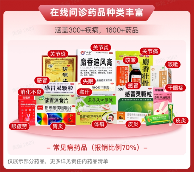 问诊购药“少花钱”: 不用再为家庭常备药、高频小病用药“掏全款”!在线问诊购药可享70%费用报销,单次最高能报1000元,年度累计保额达12000元。相当于全年日常用药有了“报销后盾”,感冒、咳嗽、皮炎、消化不良等小毛病,用药负担直降七成! 看病取药“不跑腿”: 7×24小时在线服务,药品直送到家。不用再挤门诊、等挂号,更不用抱着病历跑药房!“在线问诊加油包”提供7×24小时全天候在线问诊,不管是凌晨突发不适,还是工作日没时间去医院,足不出户就能连线专业全科医生,咨询病情、获取诊疗建议,甚至直接开处方购药。问诊后无需自己取药,药品直邮到家。从问诊到收药全程线上完成,尤其适合老人、孩子、上班族,省时又省力。 药品保障“超全面”: 1600+种药品,覆盖300+疾病,家庭需求全hold住。担心“报销药品太少,用不上”?完全不用愁!“在线问诊加油包”覆盖300+种常见疾病,小到感冒、咽炎、上呼吸道感染,大到日常需要的抗过敏、外伤处理,几乎涵盖所有家庭高频健康需求;对应的报销药品更是多达1600+种,像布洛芬(解热镇痛)、感冒灵(感冒用药)、氯雷他定(抗过敏)、等“家庭必备药”,全都在保障范围内。