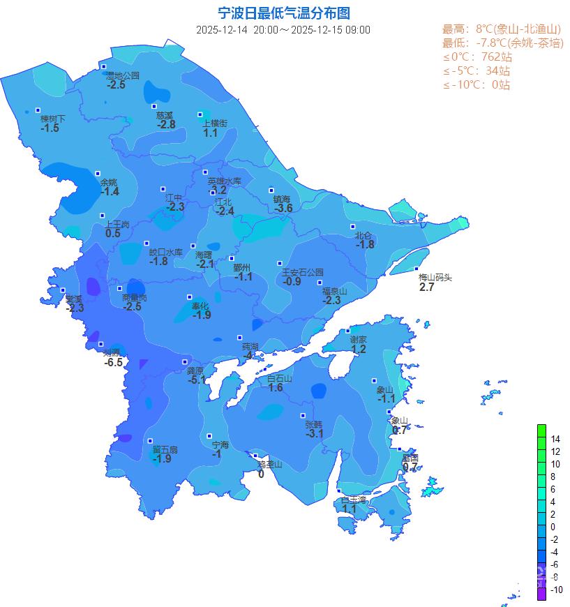 在冷空气和辐射降温共同影响下 今天早晨甬城来到本轮降温的最冷阶段 市区最低气温仅-1.1℃ 再创今年下半年以来新低 山区更是“速冻模式” 单站点最低的是余姚茶培 仅-7.8℃! 大家出门除了充分做好保暖外 也要防范冰冻的不利影响