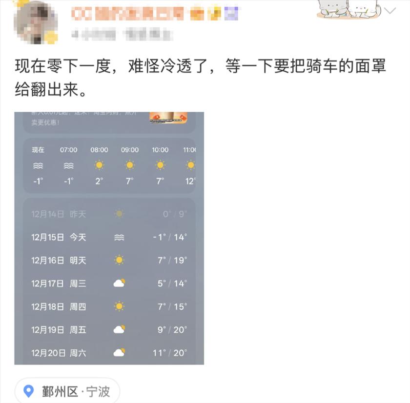 今天你穿棉毛裤出门了吗? ![]() ![]() 好在白天阳光灿烂,气温逐渐回升,今天最高来到15℃上下,午后体感不错。本轮冷空气虽然“凶猛”,但来去匆匆,回暖紧随其后,明天最高气温突破20℃,不过昼夜温差大,穿衣可以采取多层叠穿,灵活应对。 后天到18日有弱冷空气补充,最高气温稍有压制,不过回暖的势头还没有终止,19日到20日前期暖湿气流增强,最高气温“2”字头重现。 ![]() ![]() 这个周日(21日)是冬至节气,从目前预报看,届时又将有一股强势的冷空气来袭,最高气温将降至12℃左右。近期气温起伏幅度大,暗藏健康风险,大家要格外关注,及时增减衣物。 ![]() |
