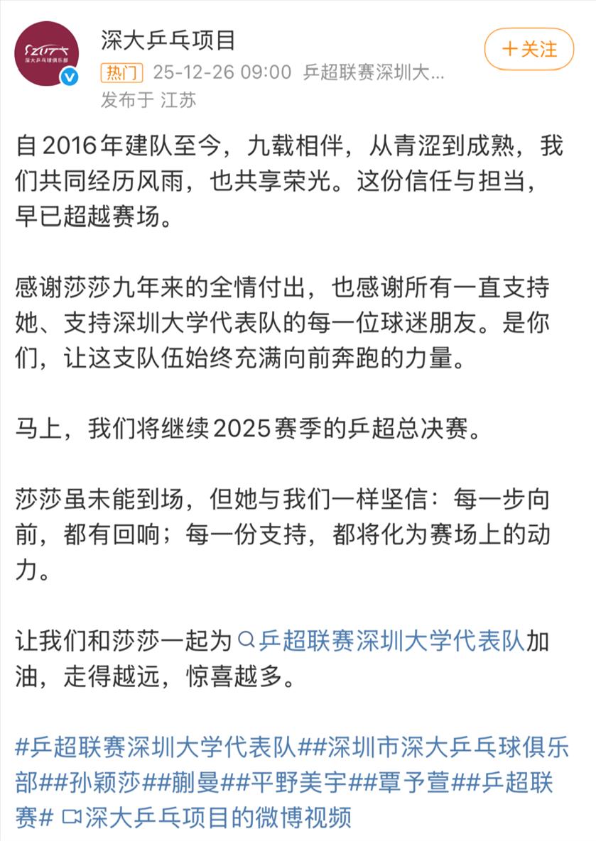 12月26日,2025年乒超联赛总决赛在南京拉开大幕。首场女团半决赛将由深圳大学对阵上海龙腾,就在比赛开始前一小时左右,深圳大学乒乓球俱乐部官方发布公告,宣布孙颖莎将缺席本次总决赛。 ![]() ![]() 在视频中,孙颖莎表示: 据此前报道,在本月中旬进行的WTT总决赛期间,孙颖莎在女单半决赛比赛过程中左脚脚踝受伤,经过治疗仍无法坚持,选择退赛。随后,中国乒协发布声明称,已立即启动保障机制,统筹协调专业医疗资源,为运动员提供系统、科学的康复支持。 |