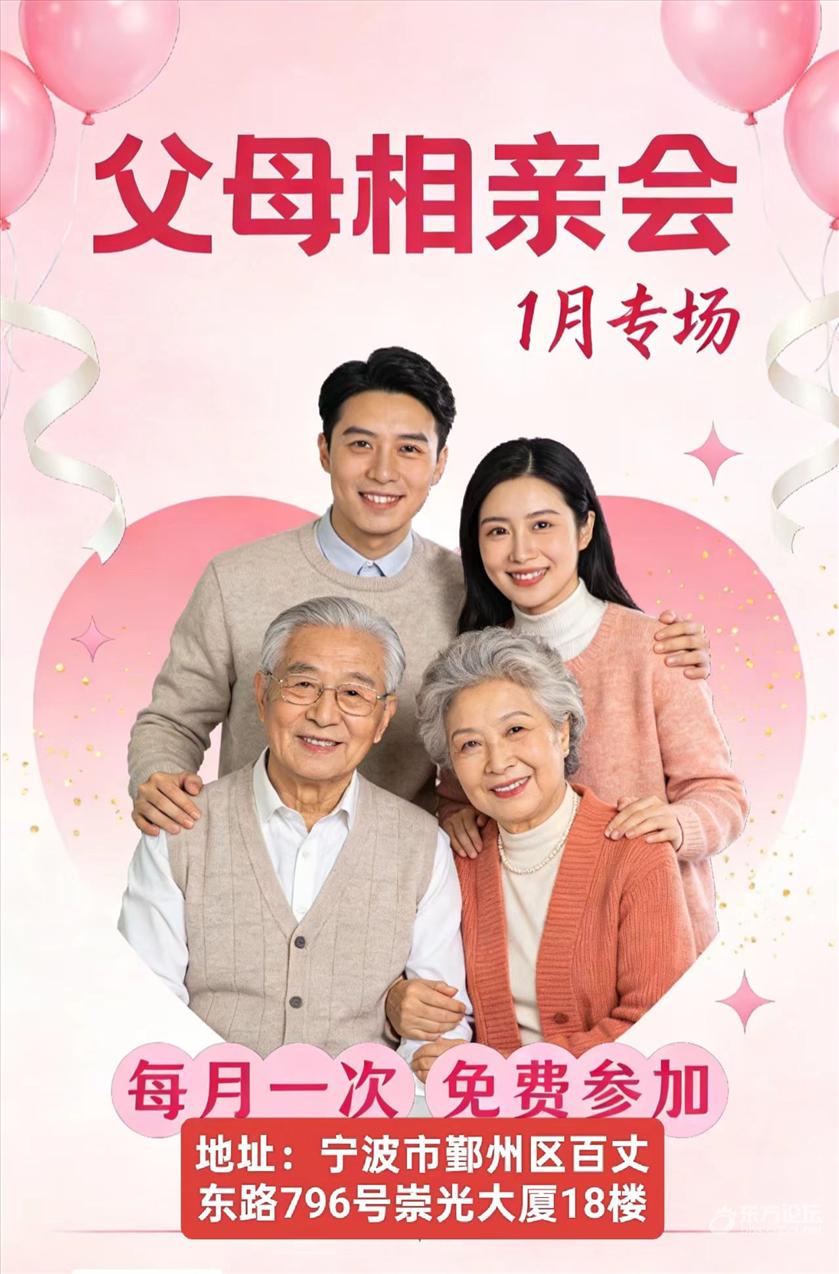 [庆祝][庆祝][庆祝]1月10日下午2点,崇光大厦18楼召开百家父母碰头会,全程免费,孩子们忙着打拼没空顾上找对象,爸妈们来帮忙搭个桥、交个心,聊聊孩子的脾性、期待,说不定就在交流间,就能为孩子们找到投缘的缘分呢。希望当天在我们红娘的协助下能促成好缘分,也预祝各位家长们聊得开心,能满载而归报名:壹五八陆七五陆五三五零
