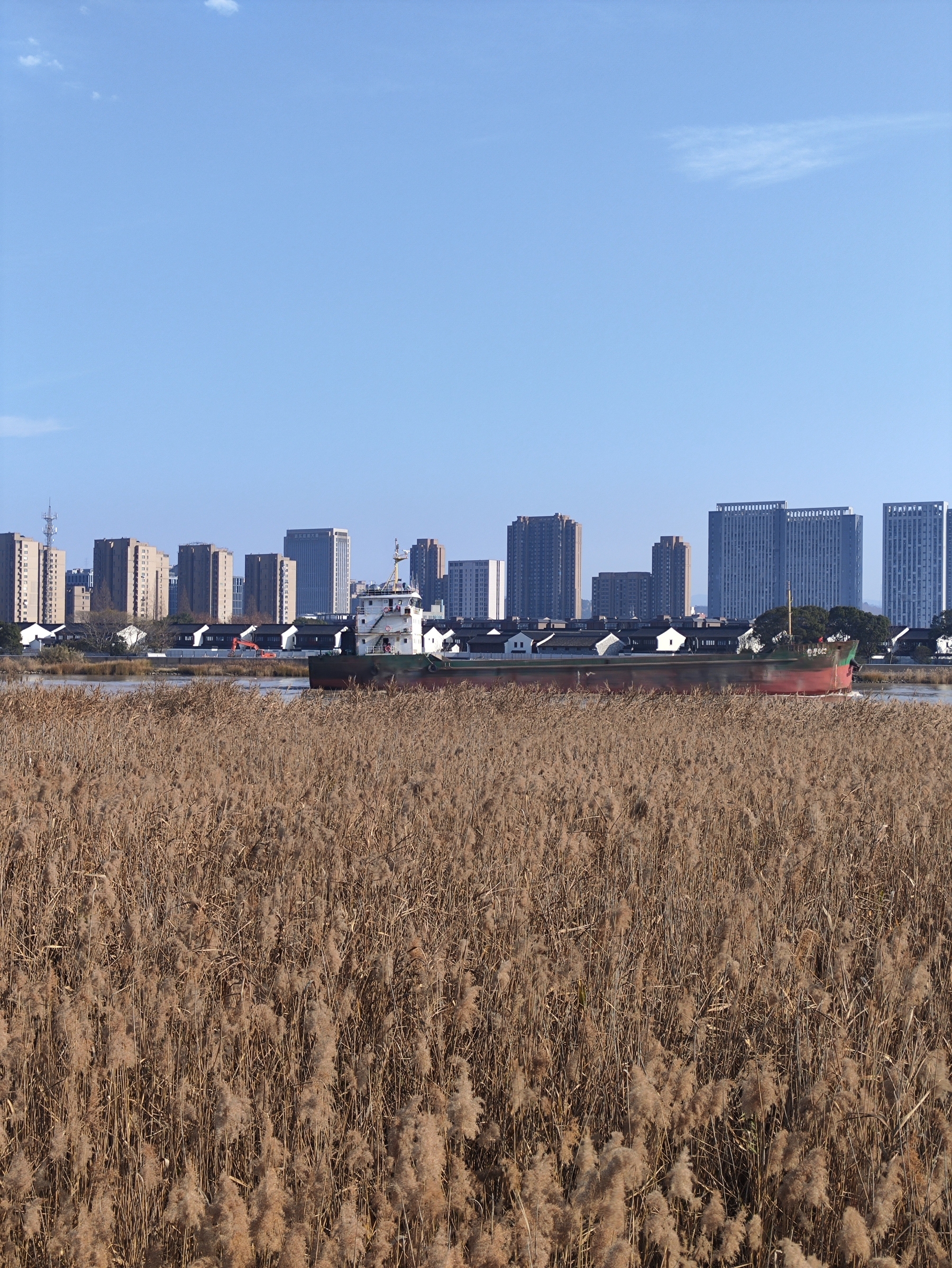 江中船舶驶过,对岸是新建的梅墟老街