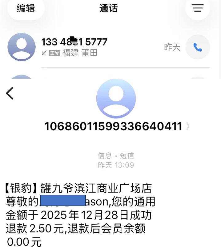 昨天下午在鄞江山上喝茶,接到我福建的电话,说我是他家店里会员,现在他们要闭店了,有余款2.5要退给我,让我把卡号发他,我说老板客气了,钱不多,不用退了,谢谢老板还专为此打电话,老板也客气地说应该的,生意本如此...相比那些从一开始开店就是为圈会员费的商家,此老板无比良心,感叹市场的残酷,劣币驱逐良币,良心商家做不下去,而黑心商家却能一直在圈钱,割完这里割那里,总能收获满满,社会的悲唉。[银豹]罐九爷滨江商业广场店尊敬的 ****ason,您的通用金额于2025年12月28日成功退款2.50元,退款后会员余额00。最后老板还是从系统里自动退回到当时充值的微信里。感谢老板,祝愿他以后的路越来越好