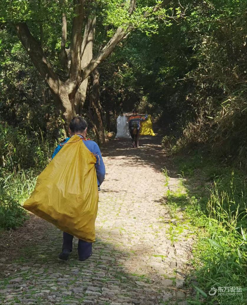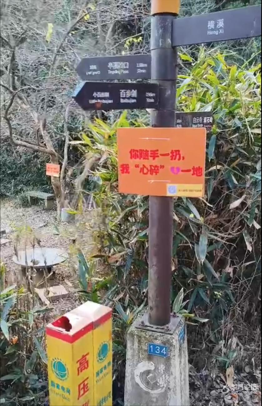 古道沿线增设的环保提示牌。 “这下看着舒服多了!”带着孩子徒步的市民王女士说,“之前来的时候满地都是垃圾,特别影响心情。今天干净多了,希望以后能一直保持。” 常来徒步的陈先生表示:“最好沿途多设置一些标识标语,提醒游客文明徒步、爱护环境。另外,要是能多设几个垃圾桶就更好了。” 横溪镇相关负责人介绍,亭溪岭古道以阳明亭为界,亭子一侧(属横溪镇辖区)的垃圾已由外包单位蓝海绿业生态建设股份有限公司完成清理。 “我们每月对人流量大的古道安排10次基础保洁,周末游客增多时还会临时加派人手,平均每天要清运20多袋垃圾。”该负责人表示,当前保洁仍面临人力不足、运输困难等问题,“平时只有1名保洁员,周末人多时最多会增加到3人,但垃圾全靠人工背下山,工作量很大。”