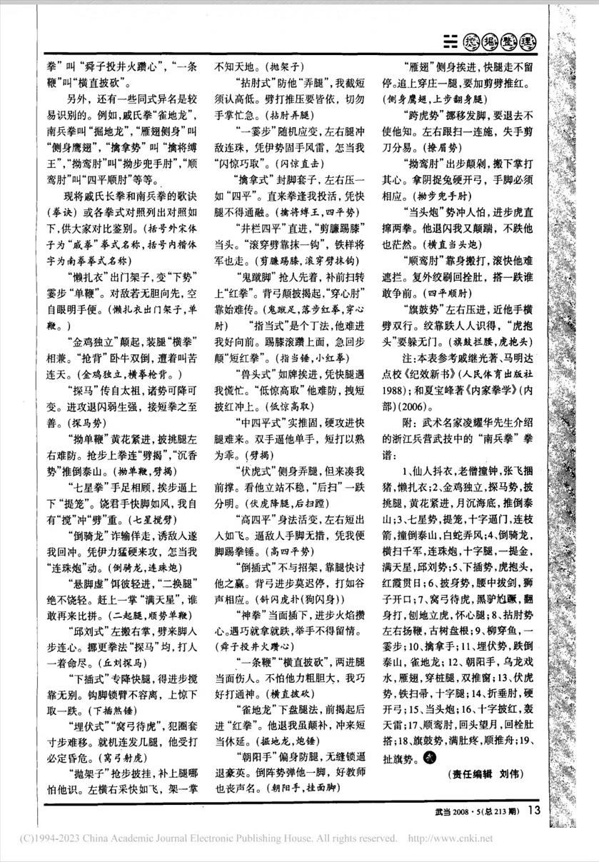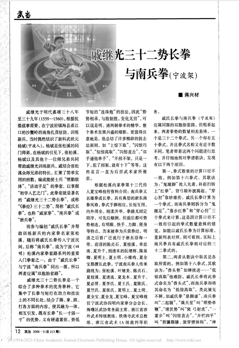 ![]() ![]() 戚继光于明代嘉靖三十八年至三十九年(1559—1560),根据抗倭战事需要,在宁波府镇海县甬江口的沙蟹岭西南角扎营驻防,训练新兵,当时偶然结识了新科武状元杨斌(宁波人)。杨斌是张松溪的同门师弟,在杨斌的引见下,张松溪、杨斌以及其他十一位师兄弟共同帮助戚继光训练新兵,戚结合张松溪众师兄弟的特长,汇聚了简单实用的招数,编成能使士兵“惯勤肢体”、“活动手足”的拳套,以掌握“初学入艺之门”。此拳套就是著名的“戚继光三十二势长拳”,或称《拳经》三十二势”,简称“戚氏长拳”,也称“戚家拳”、“南兵拳”或“浙兵拳”。而参与编创“戚氏长拳”并帮助训练新兵的内家拳名家张松溪,随后将戚氏长拳传入宁波民间,后称“南兵拳”,成为宁波(四明)松溪内家拳套路系列的重要入门拳套之一。由于“戚氏长拳”与宁波“南兵拳”同出一源,所以两者应属“双胞胎套路”。戚继光三十二势长拳是一个综合了多种拳术的优秀拳种。它集中了长拳与短打在劲力和技法上的不同长处,结合了踢、拿、跌、打各方面的内容,使其融为一体,相互引发,既有长拳“长一寸强一寸”的优势,又有硬逼紧依、势低节短的“连珠炮”的技法,因此“势势相承,与敌制胜,变化无穷”,可以说是明、清两朝拳术的精华,整个拳术发展兴盛的缩影。更值得注意地是,他总结了许多精辟的技击法原则,如“上惊下取”、“闪惊巧取”、“似惊高取”、“闪惊直击”、“双手逼他单手”、“不招不架,只是一下,犯了招架,就有十下”等等。这些名言一直为后世武术家所推崇。根据松溪内家拳第十三代传人夏宝峰祖传资料介绍:南兵拳又名雄拳或长拳,具有典型的浙东南拳风格,式手手脚相应,长短互用,内外周全,刚柔并举,拳路无固定顺序,可先后颠倒,但前后都可势势相连,有明眼、快手、力脚、便身等特点,历来被奉为兵营拳经,明清之后曾广泛流行于浙东沿海一带。前清的陈贞石、夏枝溪、单思南、夏升千,到清末的阮增辉、陈泉卿、夏明土、夏土明、小雄鸡、夏全宝都擅长此拳。宁波南兵拳人传承路线为:张松溪、叶继美、陈贞石、夏枝溪、夏清流、夏龙本、夏升千、夏必贤、夏李氏、夏王氏、夏陈氏、夏竺氏、夏张氏、夏明土、夏土明、夏全宝、夏全龙、夏宝峰。夏宝峰现任宁波武协四明内家拳分会会长、海曙区武协常务副主席、浙江省涉外武术特级教练、铁佛寺武术总教练、浙江省武术IA级裁判等职务。戚氏长拳与南兵拳(宁波架)应属同源的双胞胎套路。但粗看起来,两者拳势的数量相差悬殊,一个是三十二个拳式,另一个却有五十拳式,并且拳式名称又有近半数不同。笔者带着这两个问题进行思考,并仔细地核对拳谱歌诀,发现有以下两个原因。第一,拳式数量的计算口径不一致。例如第十六拳式,其歌诀为:“鬼蹴脚”抢人先着,补前扫转上“红拳”,背弓颠补披揭起,“穿心肘”靠妙难传。戚氏长拳计算为一个拳式,而南兵拳则拆分为“鬼蹴足”,“落步红拳”和“穿心肘”三个拳式来计算。这是因计算口径不一致而引起的拳式数量悬殊的错觉。如能以戚氏长拳为计算标准,重新列表对照,则可看到,实际上南兵拳具有戚氏长拳相对应的三十二拳式的。第二,两者从歌诀中取名是各取所需的。例如第十八拳式,其歌诀为:“兽头势”如牌挨进······“低惊高取”他难防。戚氏长拳将此拳式命名为“兽头式”,而南兵拳却将其命名为“低惊高取”。类此屡见不鲜,如戚氏拳“悬脚虚”,南兵拳叫“二起腿”,“满天星”叫“顺势单鞭”,“埋伏势”叫“窝弓射虎”,“一霎步”叫“闪惊直击”,“井栏四平”叫“剪赚踢膝、滚穿劈抹钩”,“神拳"叫 “舜子投井火躜心”,“一条鞭”叫“横直披砍”。另外,还有一些同式异名是较易识别的。例如,戚氏拳“雀地龙”,南兵拳叫“掘地龙”,“雁翅侧身”叫“侧身鹰翅”,“擒拿势”叫“擒将缚王”,“拗鸾肘”叫“拗步兜手肘”,“顺鸾肘”叫“四平顺肘”等等。现将戚氏长拳和南兵拳的歌诀(拳诀)或各拳式对照列出对照如下,供大家对比鉴别。(括号外宋体字为“戚拳”拳式名称,括号内楷体字为南拳拳式名称)“懒扎衣”出门架子,变“下势”霎步“单鞭”。对敌若无胆向先,空自眼明手便。(懒扎衣出门架子,单鞭。)“金鸡独立”颠起,装腿“横拳”相兼。“抢背”卧牛双倒,遭着叫苦连天。(金鸡独立,横拳枪背。)“探马”传自太祖,诸势可降可变。进攻退闪弱生强,接短拳之至善。(探马势)“拗单鞭”黄花紧进,披挑腿左右难防。抢步上拳连“劈揭”,“沉香势”推倒泰山。(拗单鞭,劈揭)“七星拳”手足相顾,挨步逼上下“提笼”。饶君手快脚如风,我自有“搅”冲“劈”重。(七星搅劈)“倒骑龙”诈输佯走,诱敌入遂我回冲。凭伊力猛硬来攻,怎当我“连珠炮”动。(倒骑龙,连珠炮)“悬脚虚”饵彼轻进,“二换腿”绝不饶轻。赶上一掌“满天星”,谁敢再来比拼。(二起腿,顺势单鞭)“邱刘式”左搬右掌,劈来脚入步连心。挪更拳法“探马”均,打人一着命尽。(丘刘探马)“下插式”专降快腿,得进步搅靠无别。钩脚锁臂不容离,上惊下取一跌。(下插煞锤)“埋伏式”“窝弓待虎”,犯圈套寸步难移。就机连发几腿,他受打必定昏危。(窝弓射虎)“抛架子”抢步披挂,补上腿哪怕他识。左横右采快如飞。如一堂不知大地。(抛
