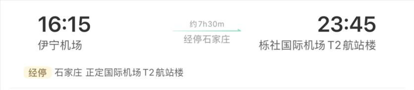 9C6875航班:7:15从宁波起飞,9:30到达石家庄,10:20从石家庄起飞,15:30到达伊宁,全程8小时15分;