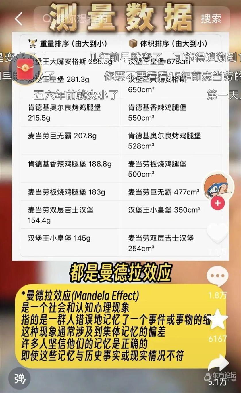不过,也有博主通过测量体积和重量的方式,认为麦当劳汉堡并没有变小,而是一种“曼德拉效应”。