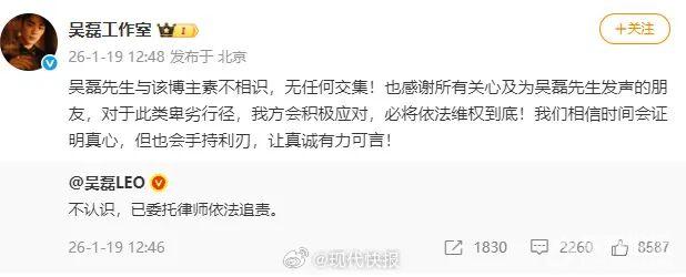 1月18日起,网友“白珊珊a”连发多条微博喊话吴磊,1月19日,演员吴磊发博回应:“不认识,已委托律师依法追责。”