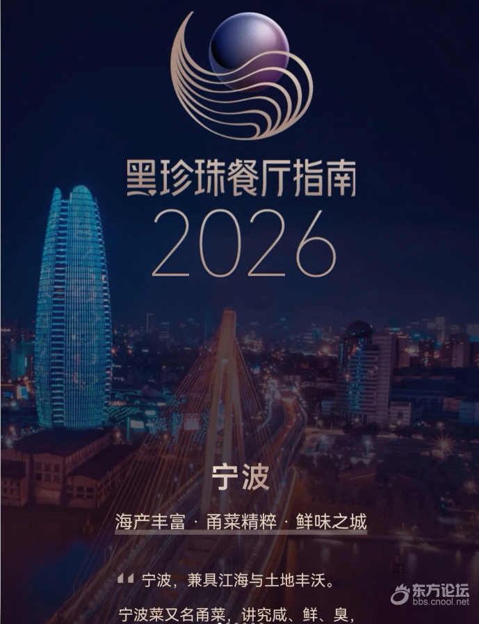 《2026年黑珍珠餐厅指南》宁波共5家餐厅上榜,都是一钻餐厅。💎海味世家·本味餐厅明州里店💎陈公馆·Champion Tower外滩店💎美宴槐树路店💎明阁💎宁波柏悦酒店·钱湖渔港相比去年,上榜餐厅和数量都持平,且都是1钻餐厅。