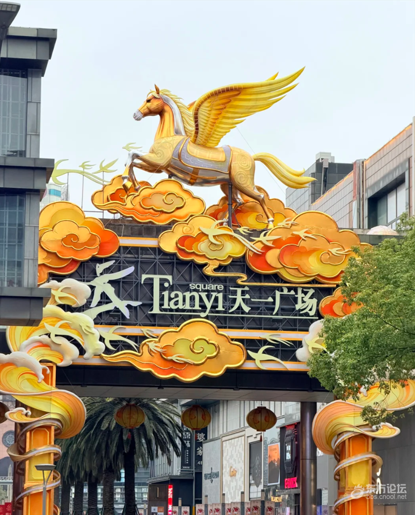 天一广场进门处悄悄换上了新年新标志,是一只踏着祥云、金光闪闪的小飞马!实物比照片还好看,金灿灿的特别精致,小马的样子又萌又吉祥,一下子就把过年的喜庆氛围感拉满了。算是逛街时遇到的第一个“新年彩蛋”吧!
