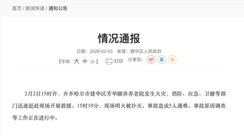 2月2日15时许,齐齐哈尔市建华区芳华颐养养老院发生火灾,消防、应急、卫健等部门迅速赶赴现场开展救援。15时19分,现场明火被扑灭。事故造成5人遇难。事故原因调查等工作正在进行中。