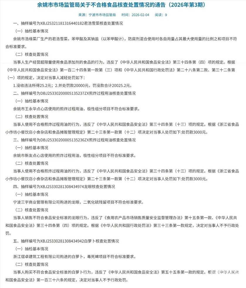 余姚市新友点心店使用的煎炸过程用油,极性组分项目不符合标准要求。处罚款3000元。