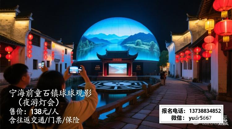 宁海前童古镇球幕观影(夜游灯会)售价:138元/人(包含往返大交通,景区大门票,保险)2月15日至23日天天发班报名电话:13738834852 加V:yudr5667