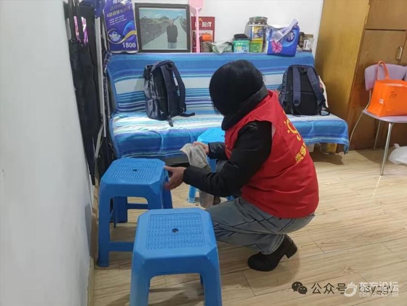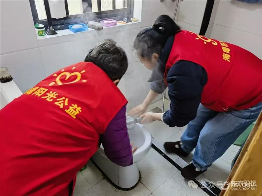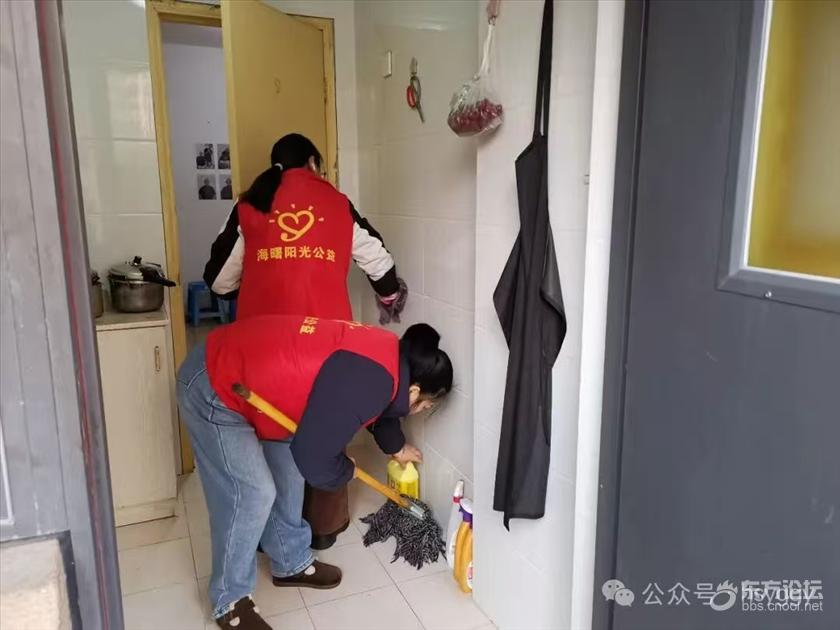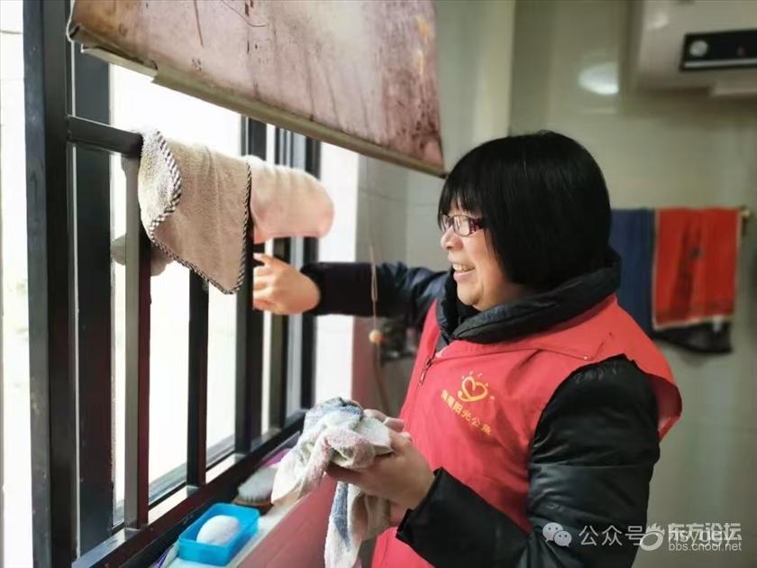 大家分工有序,忙而不乱:陈姣老师俯身擦洗灶台,油渍在手中褪去;楼芳老师将卫生间清理得光亮如新;袁静亚老师和黄老师拆下纱窗,流水刷去积尘,阳光透进来,照亮一角明亮。见爷爷还未用早餐,黄老师转身走进厨房,一碗热气腾腾的汤圆端到爷爷面前。爷爷低头吃着,嘴角漾开笑意,那笑意暖过碗中腾起的热气。