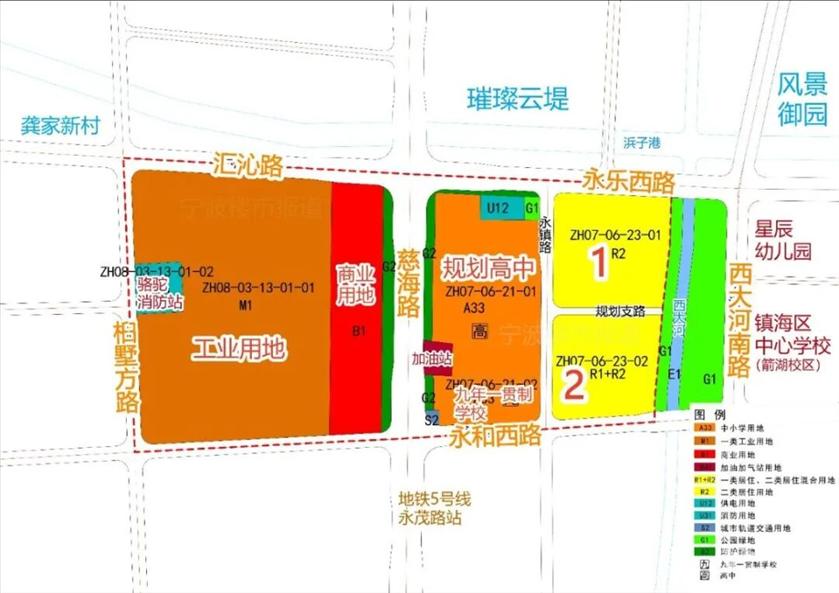 发改部门前日批复同意镇海区尚志规划高中及尚志规划九年一贯制学校初步设计,资规部门2月11日再就两所学校的用地预审和选址作批前公示。 这两所学校南北相邻,整体位于骆驼尚志区块由慈海路、永乐西路、永镇路及永和西路围合的区域内,邻近轨道交通5号线、10号线换乘站永茂路站。 该区域东面隔永镇路规划有两宗容积率分别为1.6和1.1、总体量约9.4万平方米的宅地,暂未挂出;再往东有镇海区中心学校箭湖校区、赫威斯肯特学校、尚志中学等多所学校;北面则以璀璨云堤、涌馨府、滨河名邸等住宅小区为主。 两所学校合计用地面积6.4万余平方米,合计建筑面积约6.6万平方米,总投资概算超6.5亿元,计划建设工期均为22个月。