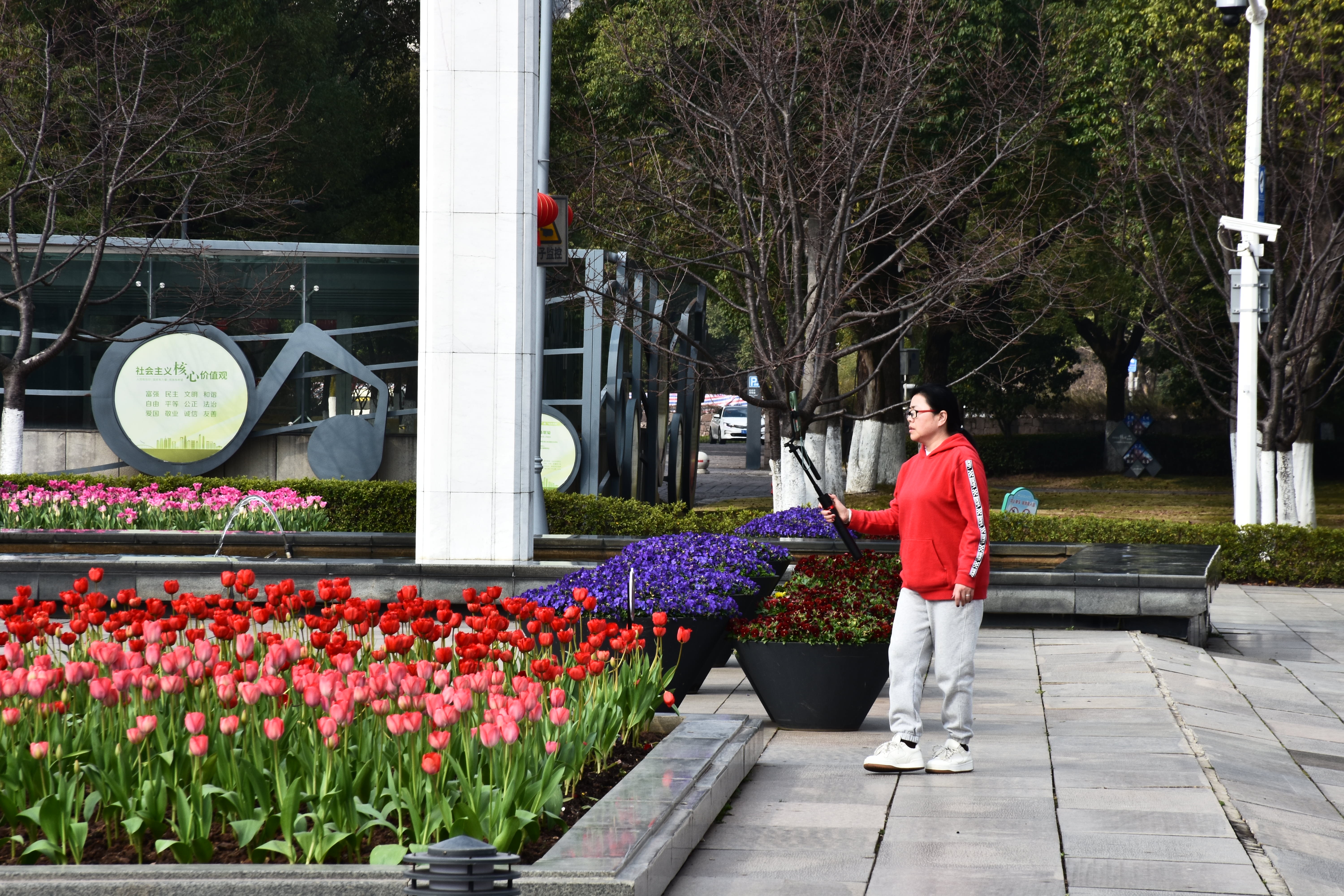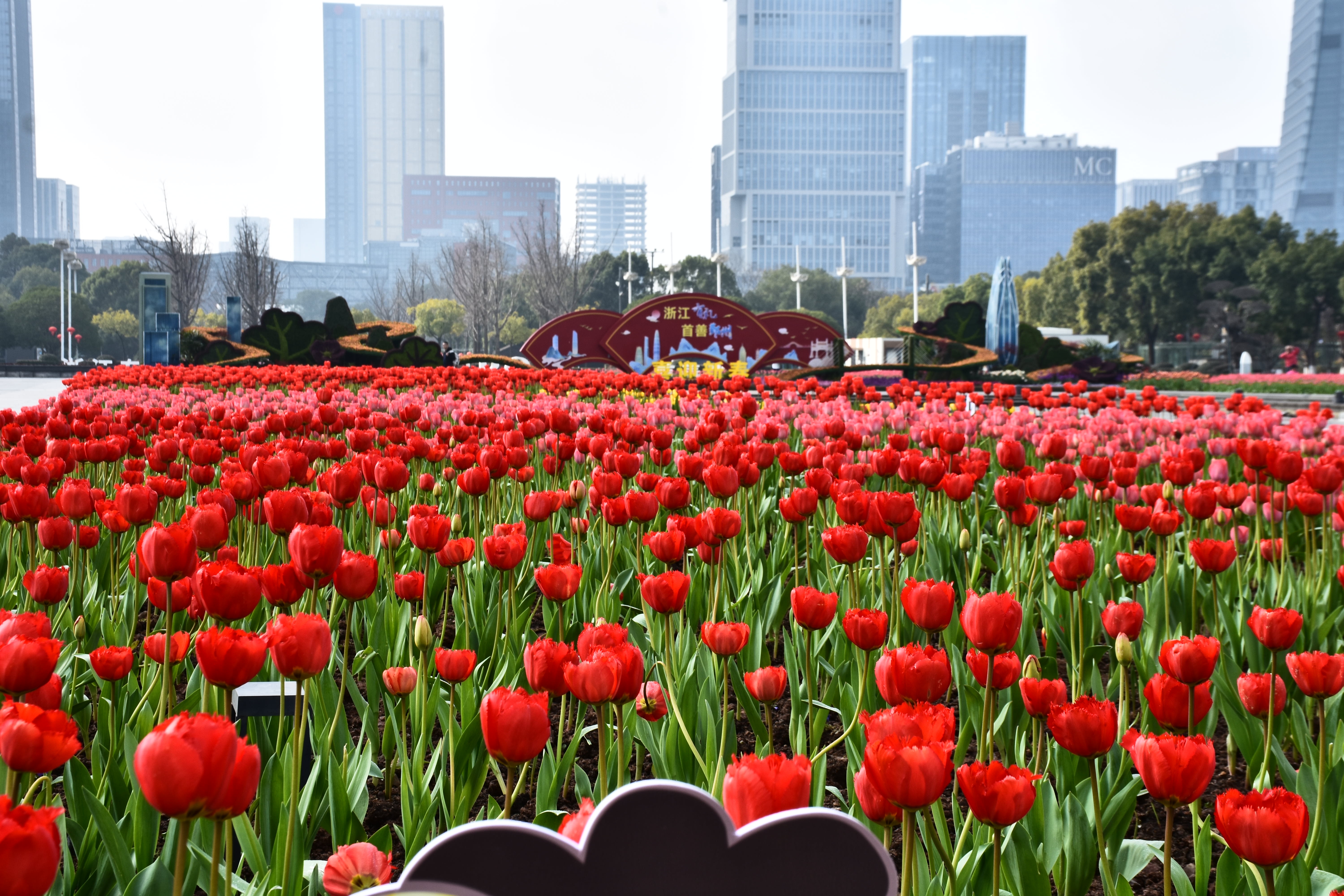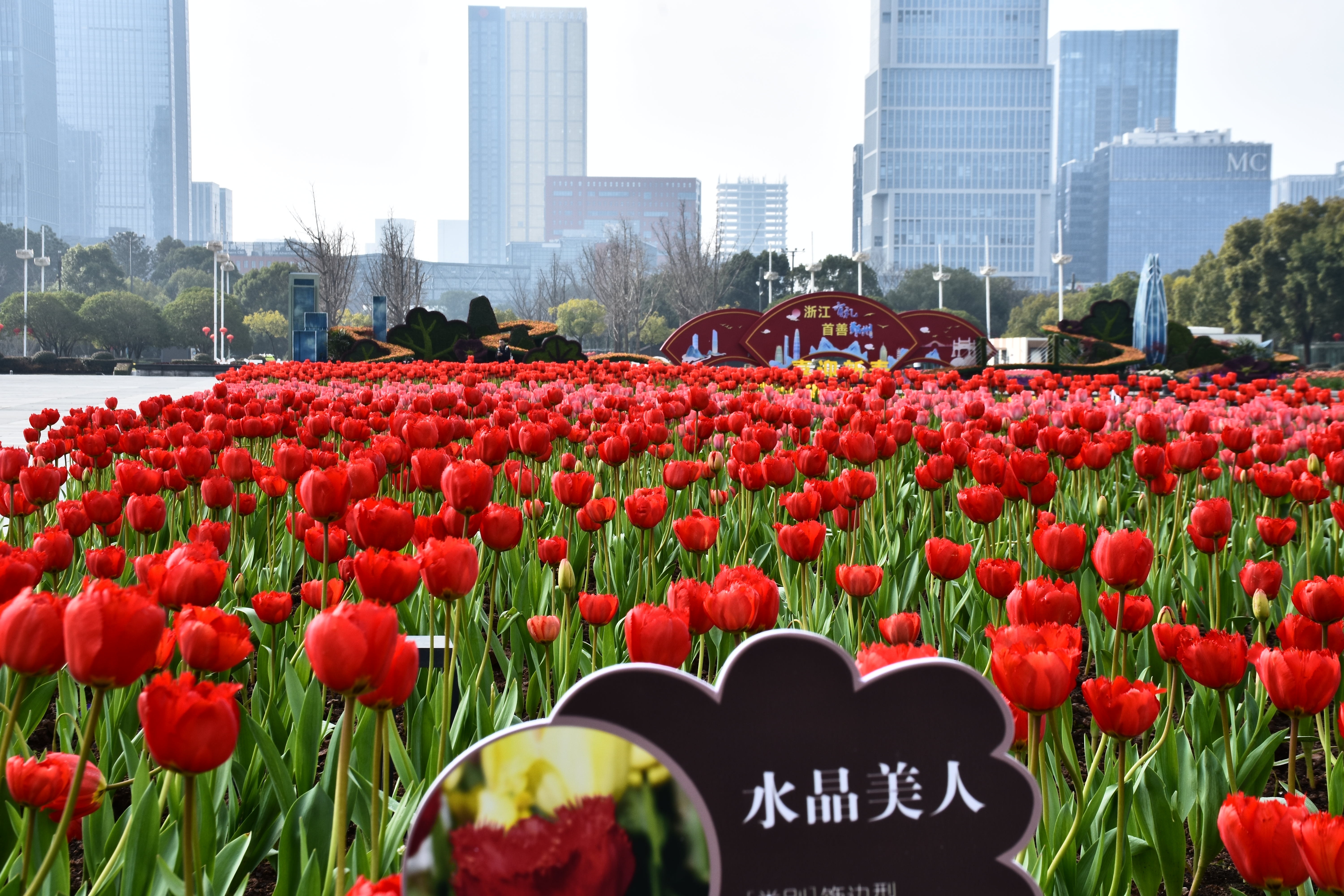 郁金香绽放的都市序曲晴光破晓染街东,艳骨初舒破冻风。紫霞堆鬓凝香远,金盏承露映楼红。车流漫逐芳茵动,人影轻随晓雾融。最是春声初唤醒,一城花事赴新隆。