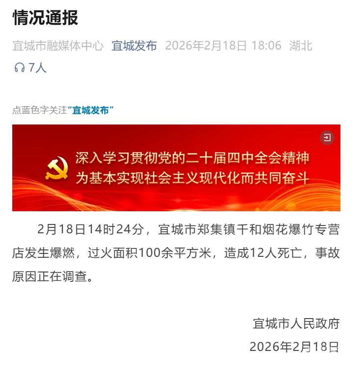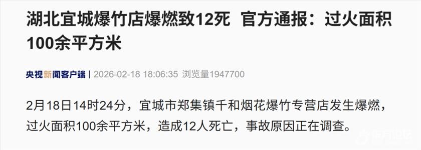 2月18日14时24分,宜城市郑集镇千和烟花爆竹专营店发生爆燃,过火面积100余平方米,造成12人死亡,事故原因正在调查。