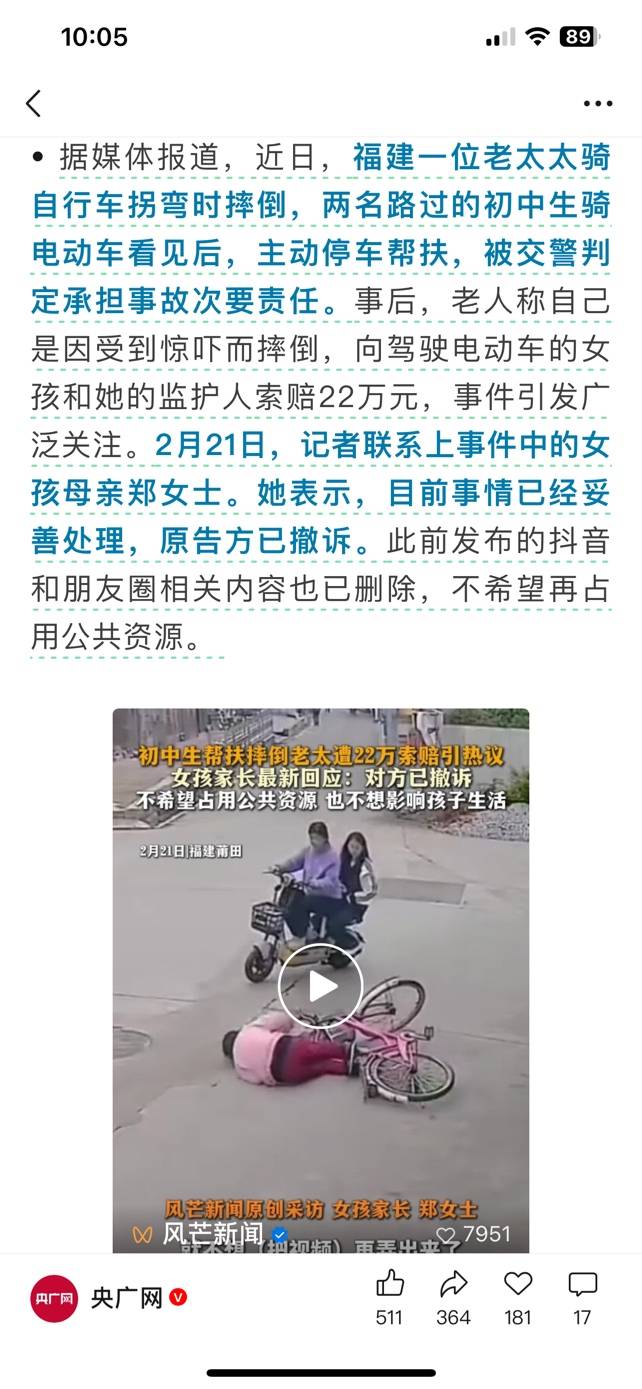 个人观点:不应该属于无接触事故,是自行车骑行人采取措施失当导致的单方面事故。如果这算无接触事故,那么有扩大无接触事故嫌疑。我们要看路权!且看自行车人单方面处置失当的界限。女孩还没有侵入自行车骑行人路权前,自行车行为人已经失衡!