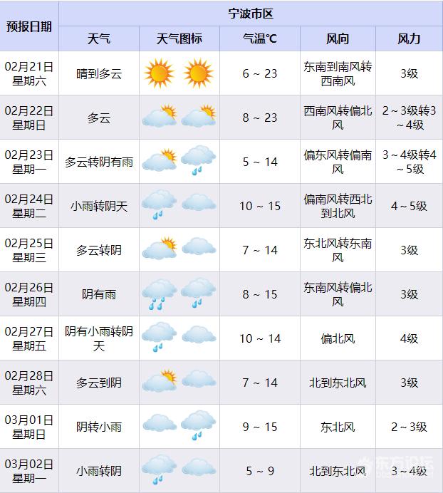 今明两天 宁波以晴暖天气为主 23日起,将迎来一次 降水、降温、大风过程 返程的市民 请及时关注天气变化 提前做好准备 今天阳光依旧准时赴约,在南风的加持下,白天最高气温将升至23℃上下,暖意融融。 明天云系略有增多,晴暖格局依旧。不过,昼夜温差较大,建议大家采用洋葱式穿衣法,方便随时调整衣着。 这两天气温将达到这波升温的顶点,正值假期尾声,晴暖天气难得,大家不妨抓紧时间,安排走亲访友、短途出游或户外休闲活动。 ![]() 市民游客在慈城古县城游玩。宁波发布特约摄影师 沈国峰/摄 天气舞台即将迎来转折,23日(初七)后期到24日(初八)将会有一次降水、降温过程。23日的气温会跌至5℃~14℃,体感由暖转冷,大家要及时增添衣物。