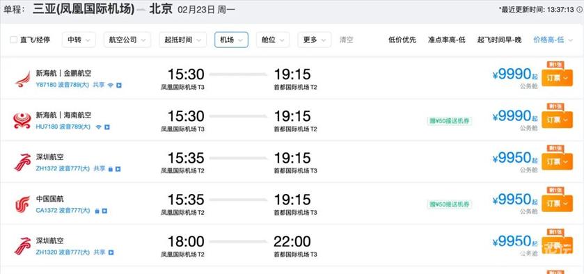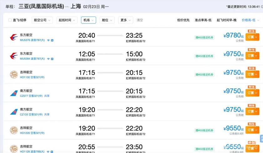 据界面新闻报道,记者查询多家在线旅游平台发现,2月22日至23日(初六至初七)期间,从三亚飞往北京、上海等核心城市的直飞航班经济舱几乎全部售罄,仅剩的公务舱票价普遍逼近万元大关。