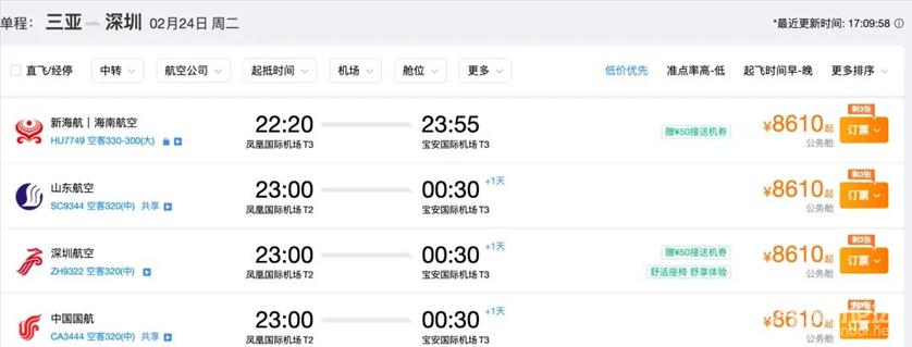与此同时,三亚至广州的直飞航班在23日已显示“售罄”;旅客只能选择耗时更久、价格仍高达近万元的中转方案。深圳航线也不例外,2月22日、23日三亚飞往深圳的直飞机票全部售罄,一直到24号(周二)才有直飞深圳的航班,售价仍超8000元。