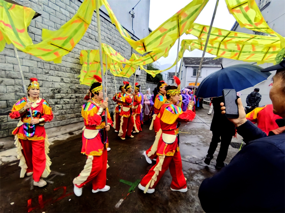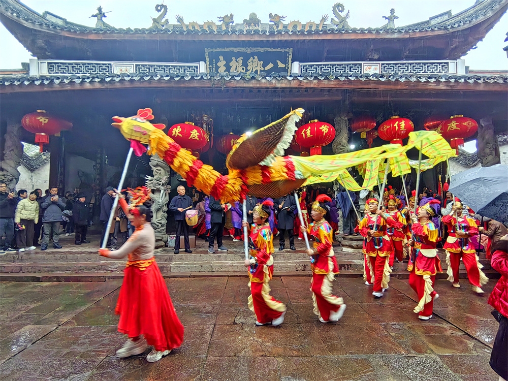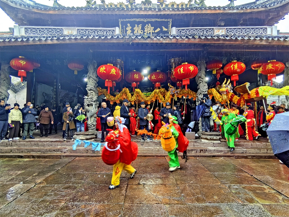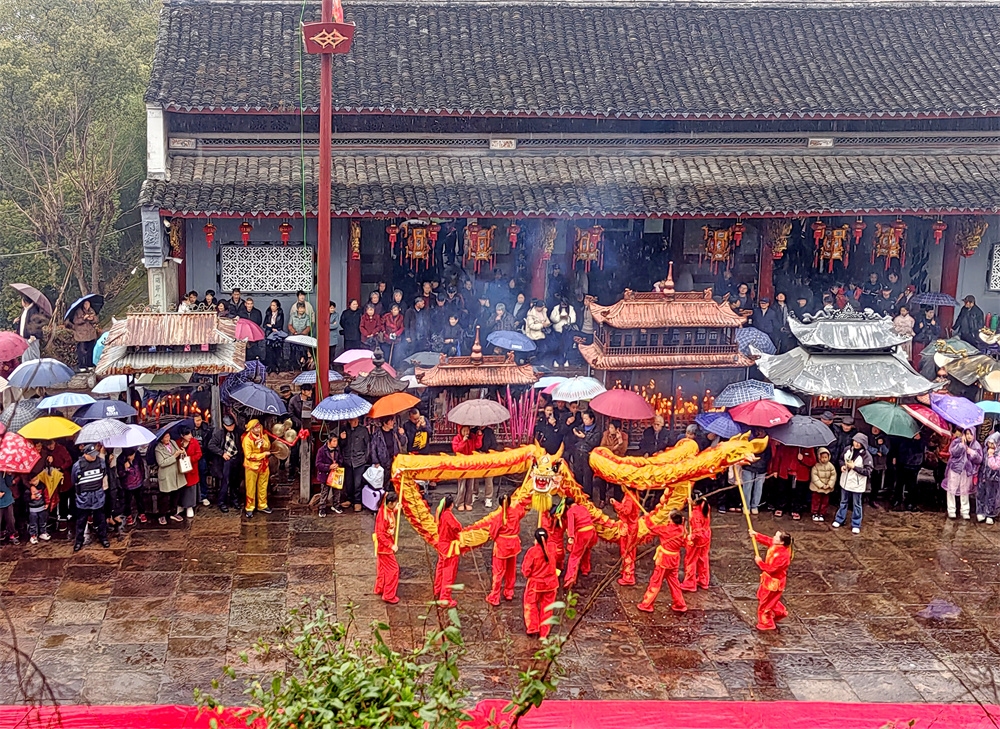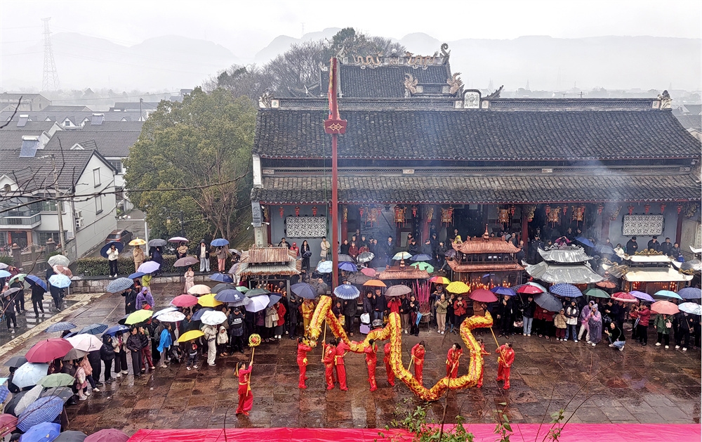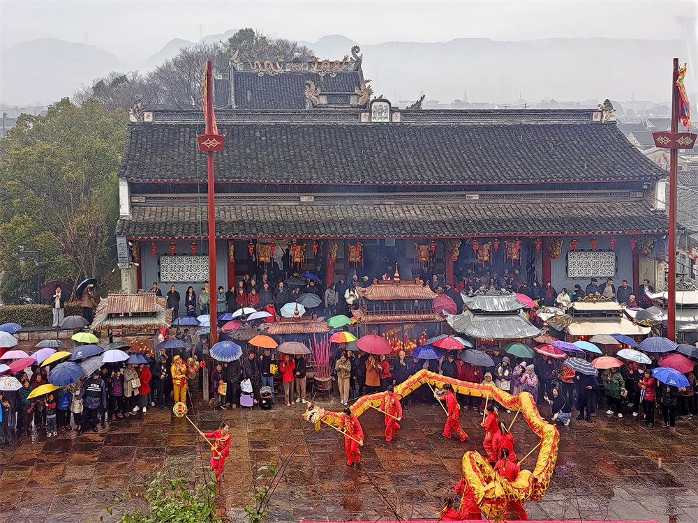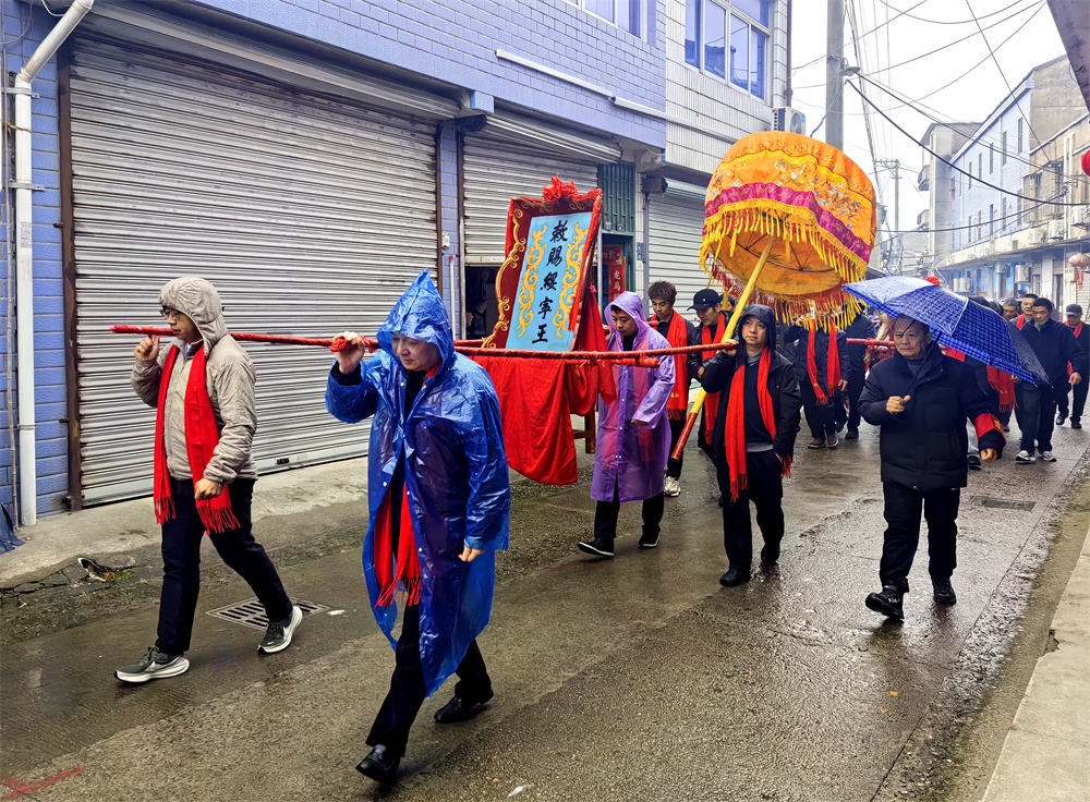 今天是农历正月十三,是奉化萧王庙举行庙会的日子,今年的萧王庙庙会是由岭丰村举办的。尽管天气阴雨,人们的热情很高,庙会很热闹。庙会的队伍出发了
