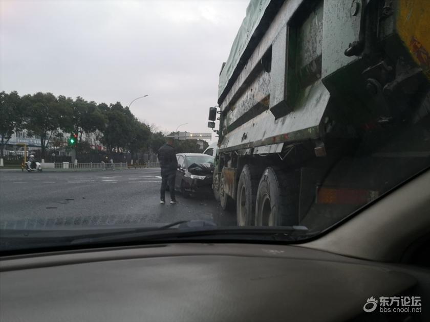 今天早上6点35分,在江北的一个左转车道上,一辆小车与大头泥车较劲,顶上了,结果可想而知,小车被撞扁了,人是没事,这么早,人家警察都还没有上班那,堵在左转道上,我从边上过,这辆小车肯定有问题,人家左转,你凭什么与人家硬扛!