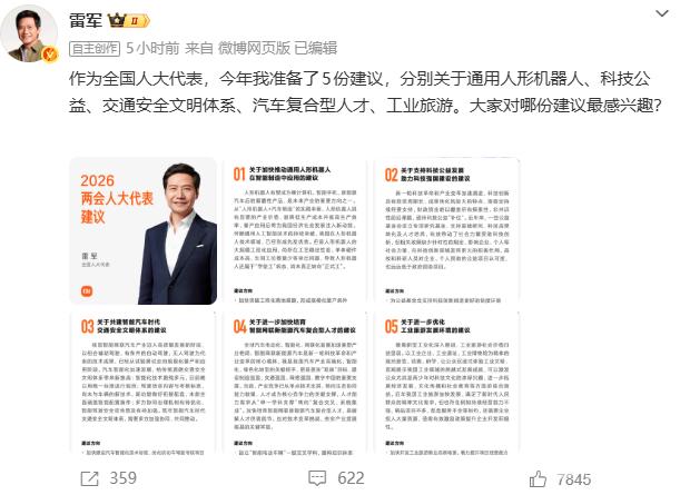 3月4日,全国人大代表、小米集团创始人雷军在个人社交账号介绍了他的2026两会建议。 ![]() 今年,雷军带来5条代表建议: