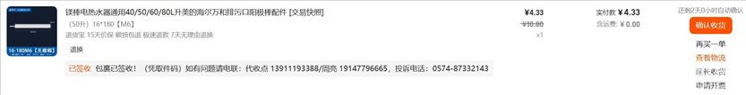 家里的电热水器用了已经有8年多了,按理说已经是报废了,但是我想还是用一个镁棒替换一下,重新使用,节约一点。在网上淘了一根义乌那边发过来的镁棒,是4元3毛三分钱,很便宜,然后就自己动手换了一下,把室外的那个总龙头关掉,然后把镁棒拿出来重新换根新的上去就可以了,50升的热水器,我选了m6的镁棒,结果是对的。