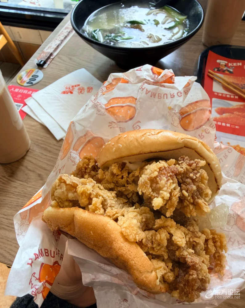 点餐时看到这里美食种类好多 除了炸鸡汉堡 竟然还有煲仔饭 炒饭 炒面 年糕汤 我们点的青菜牛肉年糕汤很好吃 汉堡也非常美味 里面沙拉酱挺好吃的 价格比很多汉堡店便宜 图里的双层鸡腿堡里面肉好多