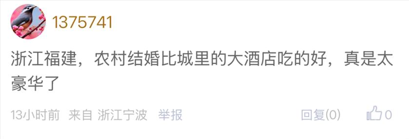 在大众的普遍认知里,农村婚宴或许还停留在简单朴素、几桌家常菜的印象中。然而,随着时代的发展,如今不少地方的农村婚宴早已今非昔比。最近,东论一网友称和外地同事去参加宁波农村的婚宴,回来后该同事那是一路感慨,直呼大开眼界! ![]() ![]() ![]() 这件事在网上也引起了热议,东论网友们纷纷发表自己的看法。有网友调侃道:“靠山吃山,靠海只能吃海鲜,如果是内地还吃海鲜才是真土豪!” ![]() 仔细想想,这话还真有几分道理。宁波地处沿海,海鲜资源丰富,在婚宴上摆上这么多海鲜,也算是因地制宜,把当地的特色发挥到了极致。 还有网友说:“浙江福建,农村结婚比城里的大酒店吃的好,真是太豪华了。” ![]() 也有网友算了一笔账:“农村办酒席,成本应该 3000 左右,比大酒店划算太多。” ![]() 确实,在城里大酒店办一场婚宴,动辄上万甚至几十万,而宁波农村的婚宴却能在保证菜品质量的前提下,把成本控制得相对较低,这无疑是一种非常明智的选择。 更有网友幽默地说:“农村吃饭,没有预制菜。还能顺手去田里拔菜背走。” ![]() 看到这些,小编也不禁感慨,现在这农村婚宴凡是在家办的,看着比城里的婚宴还豪华,只不过风格不同,城里的婚宴看着洋气,但是农村的婚宴更接地气。虽然说现在农村各地的风俗习惯都不一样,但据了解,按照个人餐标200-300元来说,一桌10个人,菜金怎么着也要几千元! 而且如今农村的婚宴也比较接地气,氛围比酒店好很多,有什么喜事大家一起帮忙。其实这场婚宴,它也让我们看到,农村婚宴不再是简单朴素的代名词,而是可以豪华、可以特色。