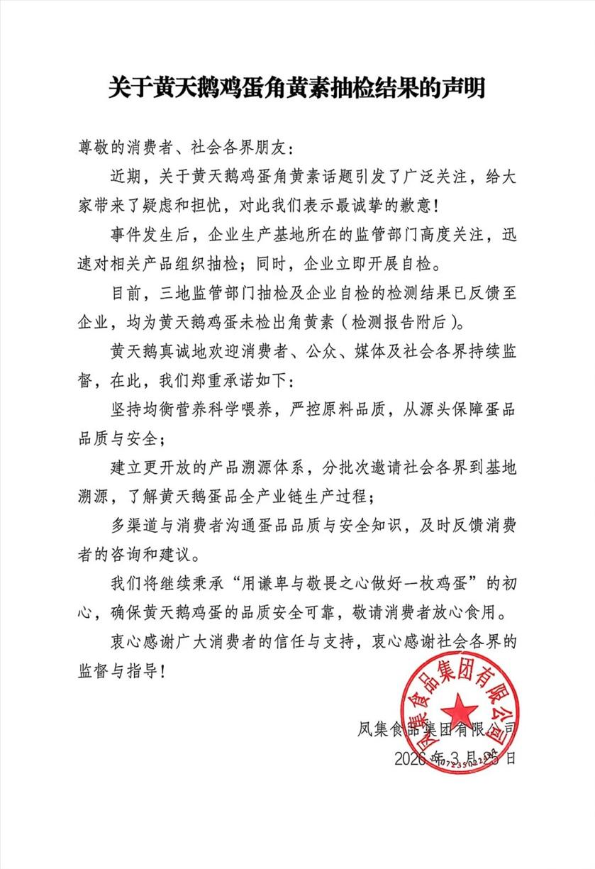 黄天鹅3月25日就鸡蛋角黄素抽检结果发布声明。声明称,目前,三地监管部门抽检及企业自检的检测结果已反馈至企业,均为黄天鹅鸡蛋未检出角黄素(检测报告附后)。