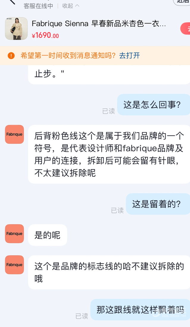越来越看不懂女装,特别是Fabrique这个牌子,这如此突兀、格格不入的红线在后背,不知是何意味,问完客服我也是无奈地笑了 是我太土了,追不上它的潮流,作为消费者,我真的不想和他们“连接”,更不想通过这跟奇丑无比的线“连接”在一起。