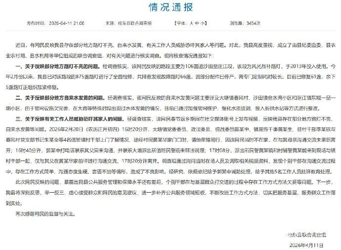 近日,湖南郴州桂东县大塘镇村民黄先生在社交平台发视频称,其因反映当地路灯不亮等问题被镇领导上门威胁,引发关注。 桂东县联合调查组4月11日晚发布情况通报: ![]() 近日,有网民反映我县存在部分地方路灯不亮、自来水发黄、有关工作人员威胁恐吓其家人等问题。对此,我县高度重视,成立了由县纪委监委、县农业农村局、县水利局等单位组成的联合调查组,对有关问题进行核实调查。现将核查情况通报如下: 一、关于反映部分地方路灯不亮的问题。经调查核实,该网民反映的路段主要为106国道沙田至沤江段,该段为风光互补路灯,于2013年投入使用。今年2月份以来,我县已对该路段的875盏路灯进行了全面检修,共排查发现故障路灯66盏,因部分配件已停产,需专门定制耗时较长,目前已修复61盏,余下5盏路灯正组织加紧修复。 二、关于反映部分地方自来水发黄的问题。经调查核实,该网民反映的自来水发黄问题主要涉及大塘镇春风村、沙田镇金水湾小区和沤江镇东城一品一期小区,由于管网设施欠完善,在大雨等特殊时段出现过水体发黄的情况,目前已通过加强管网维护、强化水质监测、接入新供水站等方式进行整改。 三、关于反映有关工作人员威胁恐吓其家人的问题。经调查核实,该网民春节返乡期间在社交媒体账号上发布视频,反映我县存在部分地方路灯不亮、自来水发黄等问题。2026年2月20日(农历正月初四)16时20分许,大塘镇党委委员、政法委员、统战委员郭某中、镇宣传干事黄某生、驻村干部李某钦与春风村党支部书记朱某全等4名值班镇村干部上门了解情况,途经村民黄某华家门口时,请他带路同行,因该网民当时不在家,在与其母亲沟通交流未果后离开;16时40分许,郭某中打电话联系其父回来沟通,并联系大塘派出所值班民警前来释法说理;17时08分,派出所民警黄某镜和村辅警黄某能来到现场与镇村干部一起,仅与其父在黄某华家前坪进行沟通交流,17时20分许离开。调查组通过询问当时在场人员及调取相关视频资料,发现个别干部在沟通交流过程中,存在工作方式简单、沟通态度生硬、言语不当等情形,造成了不良影响。经研究,依规依纪给予郭某中诫勉处理,给予其他5名工作人员批评教育处理。 此次网民反映的问题,暴露出我县公共服务管理和保障水平还有差距,个别干部在与基层群众打交道的过程中存在工作方式方法欠妥等问题。下一步,我县将深刻反思、举一反三,虚心接受群众和网民的意见建议,进一步补齐公共服务领域短板,不断改进工作方式方法,切实把服务基层、服务群众工作落到实处。 ![]() 记者注意到,相关视频在网上引发热议,其中最高点赞为22万。 当地回应:“不存在威胁,只是普通协调工作。郭姓领导是大塘镇党委委员,目前在县里开会,对于威胁举报人的说法,不能听他的一面之词,很多人反映问题可能过于偏激。” |