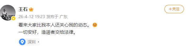 随后12日19时许,王石本人微博发文:看来大家比我本人还关心我的动态。一切安好,造谣者交给法律。