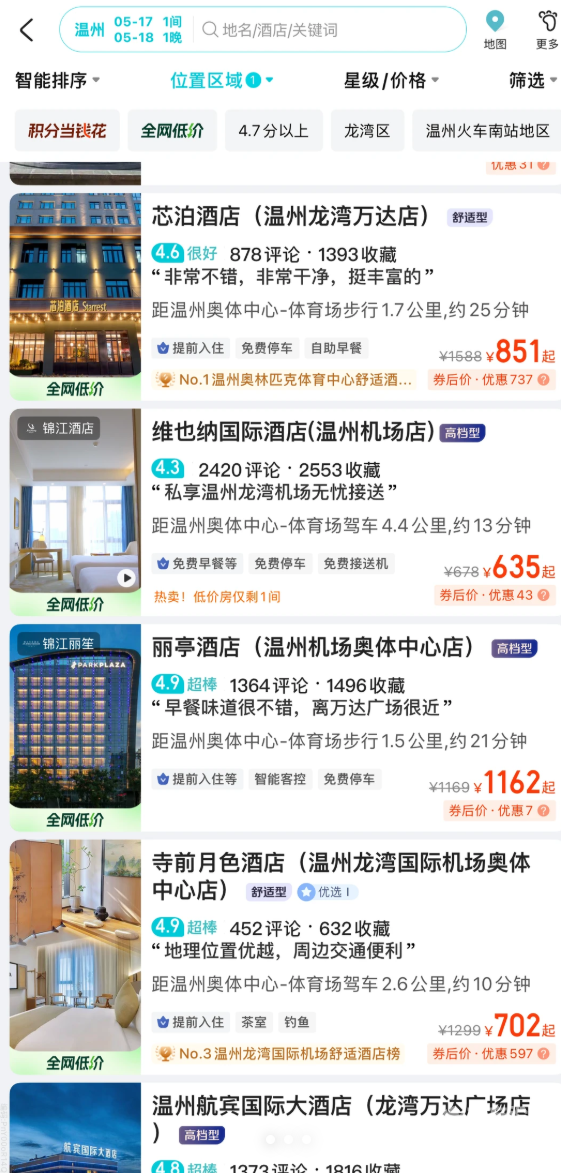 温州的格局不行啊,像汉庭这种级别的酒店平时200块,周杰伦演唱会那三天要700+,全季酒店1200你说像话吗??想钱想疯了吧!!这搞得我都打算当晚就开车回宁波了