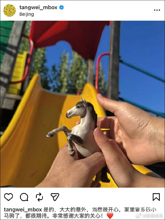 昨天,汤唯在社交平台晒出一只小马驹照片宣布怀二胎喜讯:“是的,大大的意外,当然很开心,家里要多匹小马驹了,都很期待。”稍早前,韩媒也称汤唯方承认怀二胎,但具体生产时间不明确。据悉,汤唯与导演金泰勇2014年结婚,2016年,汤唯在香港产下一女。恭喜!